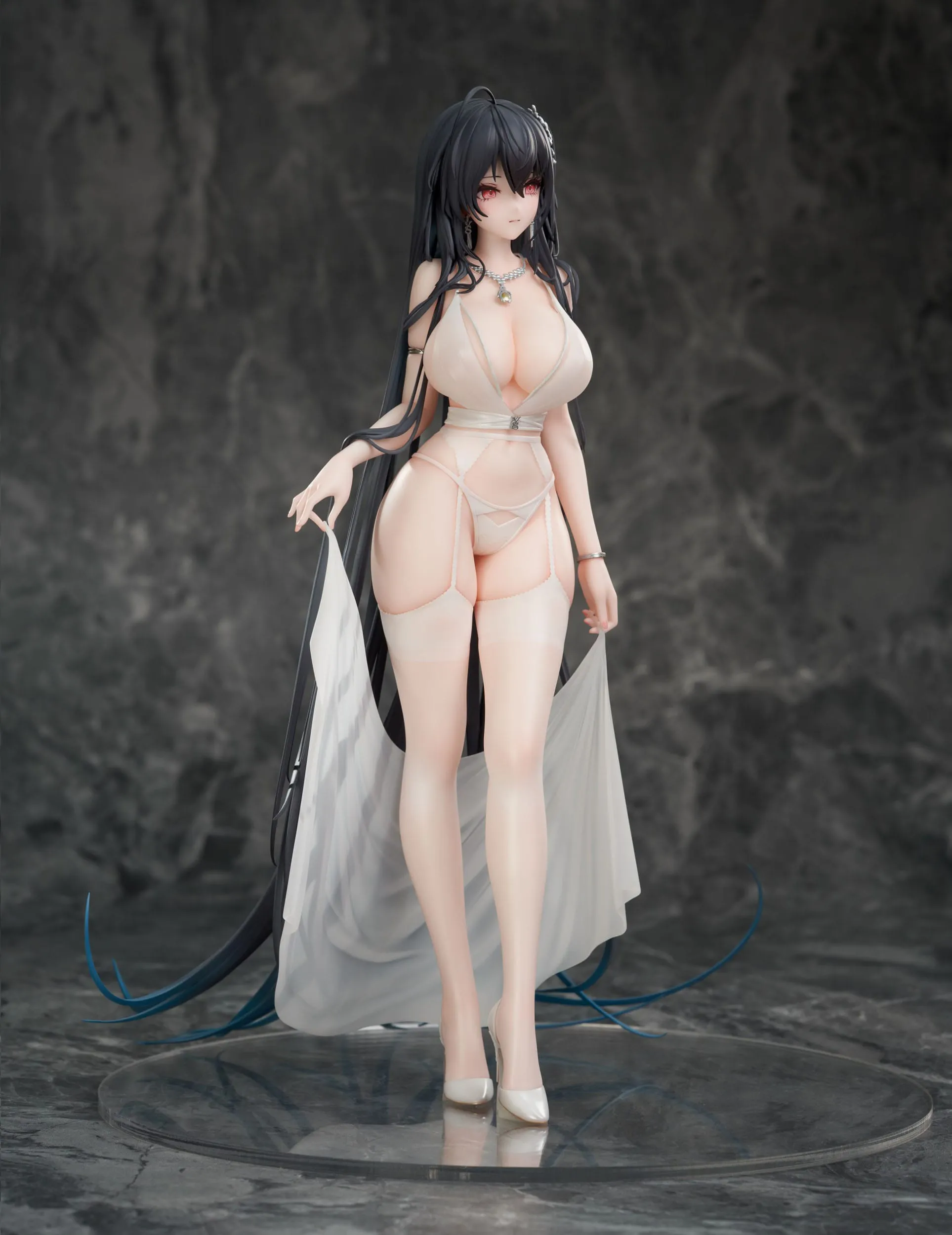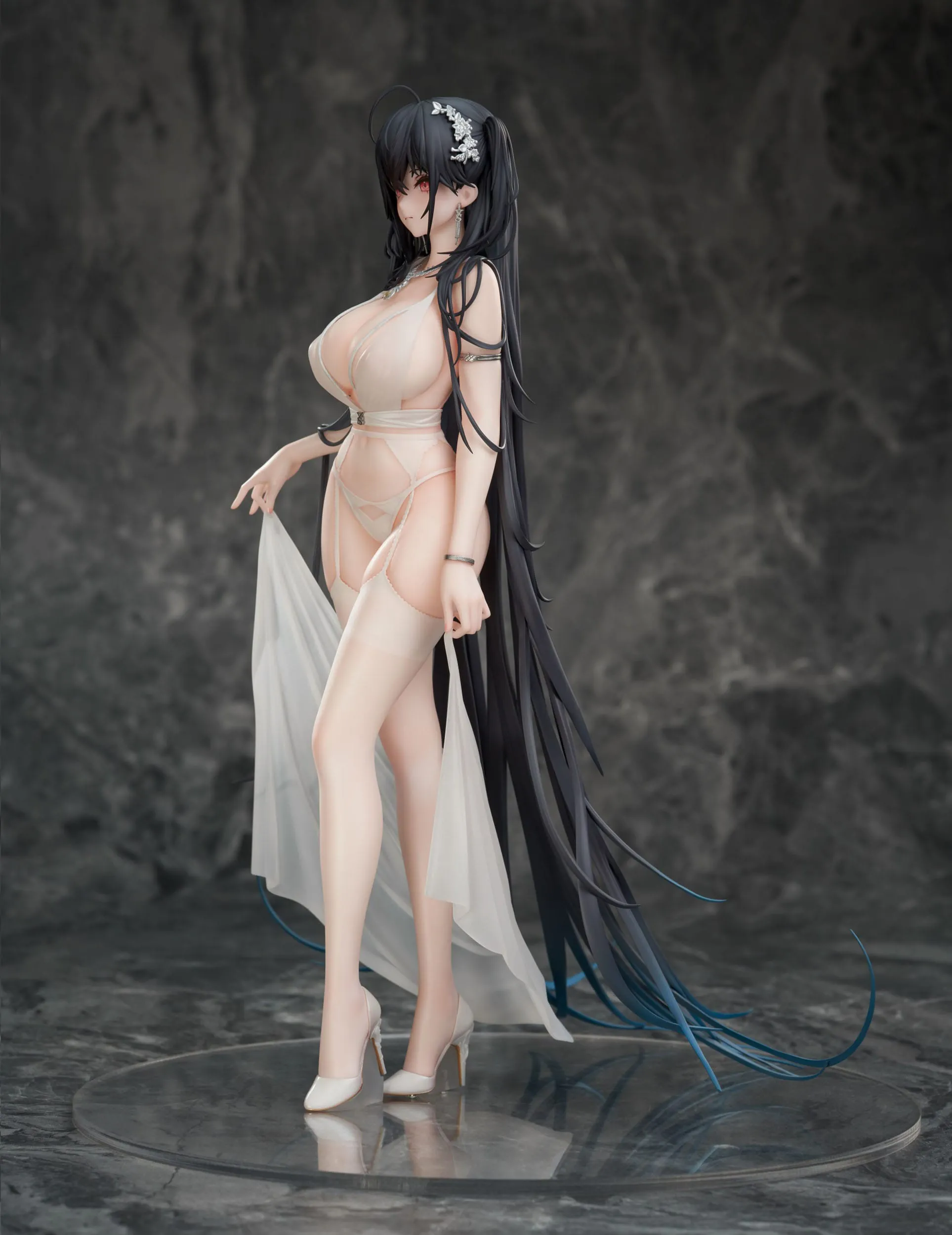 El diseño de esta figura se basa en el traje de boda de Taihou “Temptation on the Sea Breeze“. El vestido con la espalda muy abierta, adornos para el cabello que imitan flores y la línea sexy del cuerpo escondida en el vestido semitransparente son realmente llamativos.