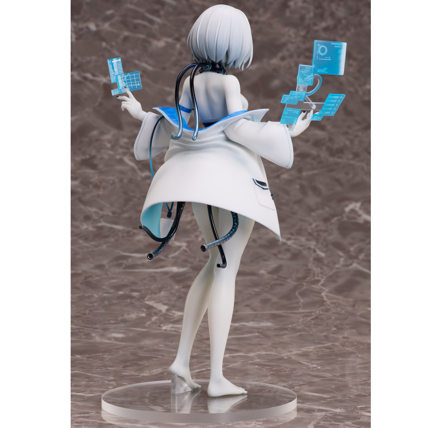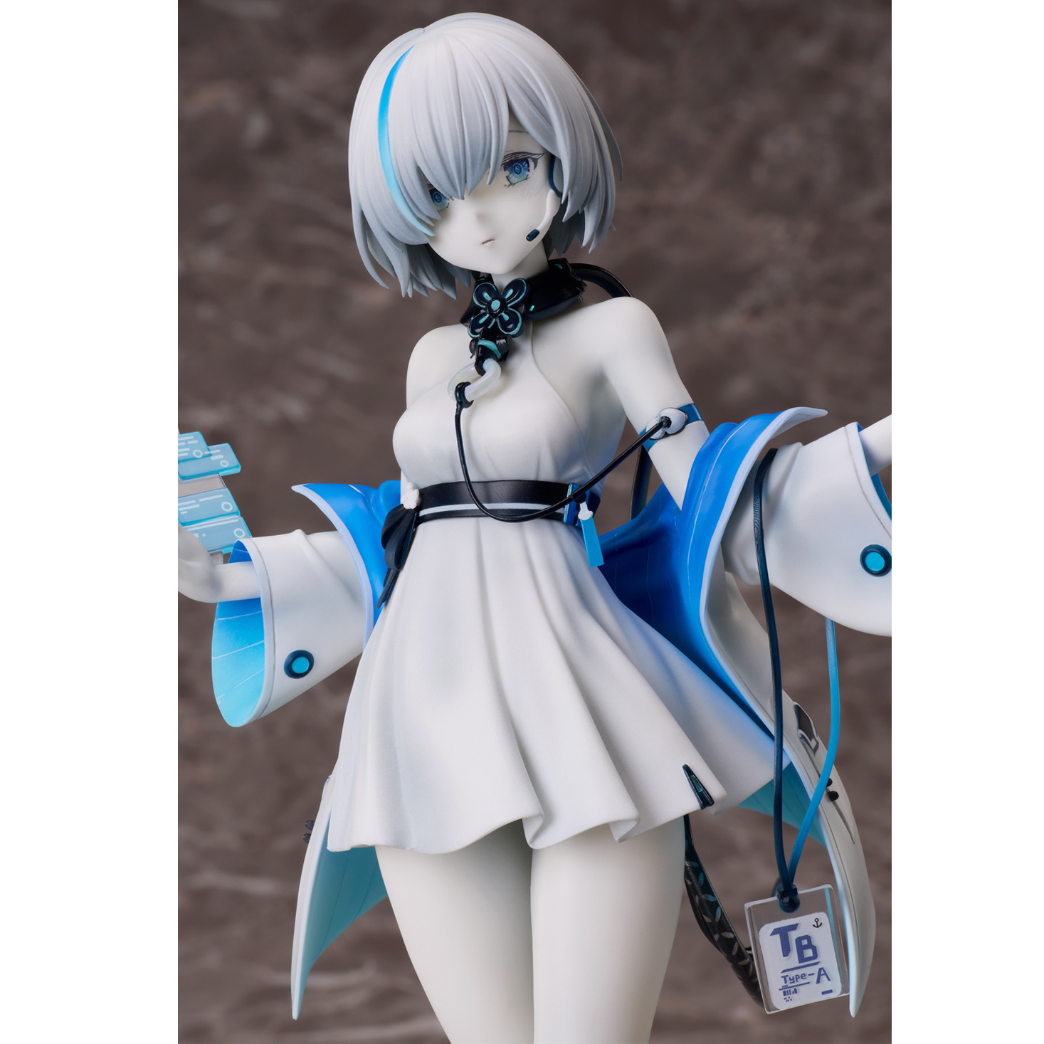 La figura de TB se destaca por su detallado trabajo artesanal que captura fielmente la ilustración oficial del personaje. Desde los cables que emergen de su espalda hasta la chaqueta en capas que luce, cada elemento ha sido esculpido con precisión. Los displays espaciales que flotan a ambos lados añaden un toque futurista y único a la figura, haciendo que esta pieza cobre vida de manera espectacular.