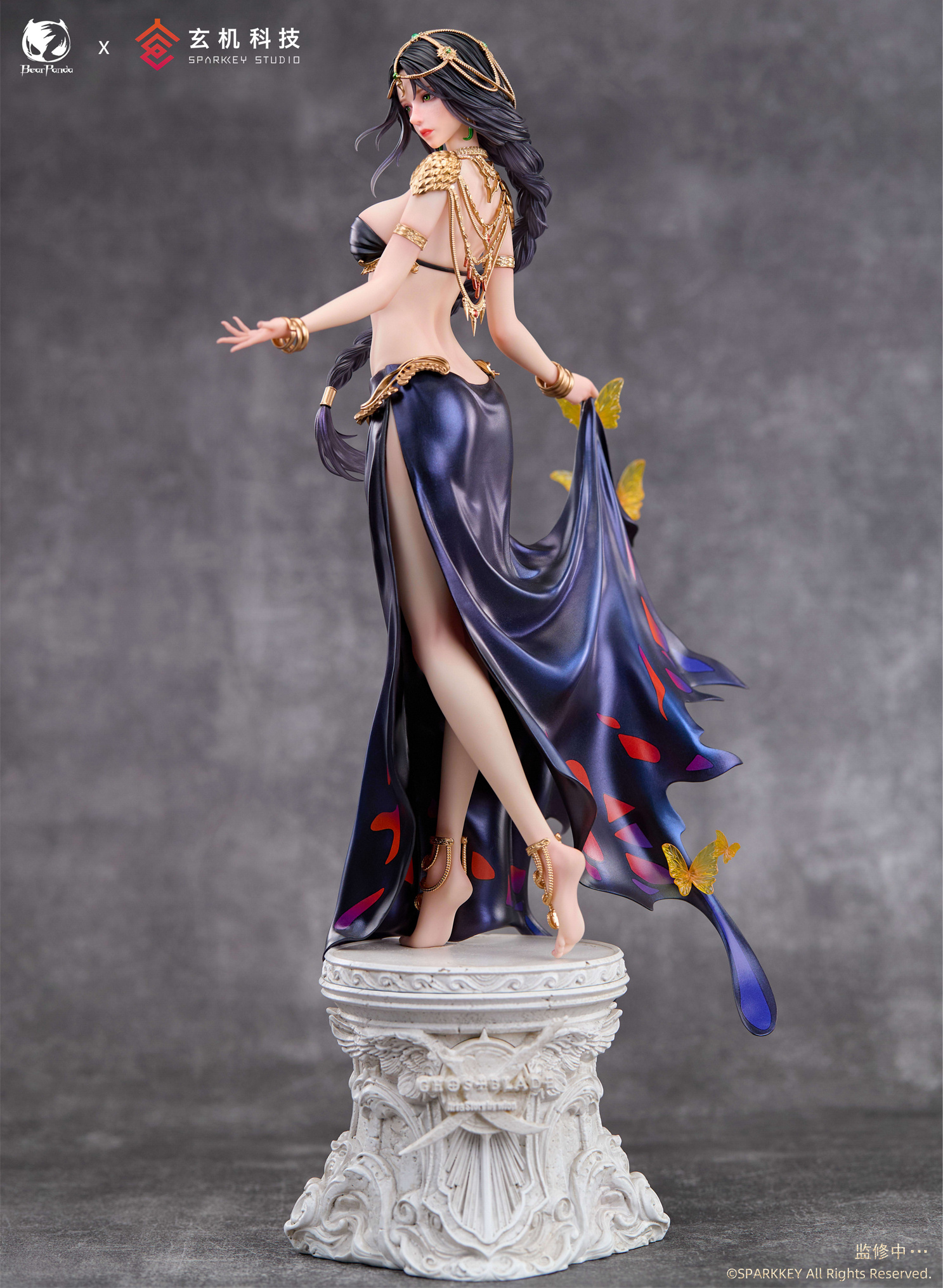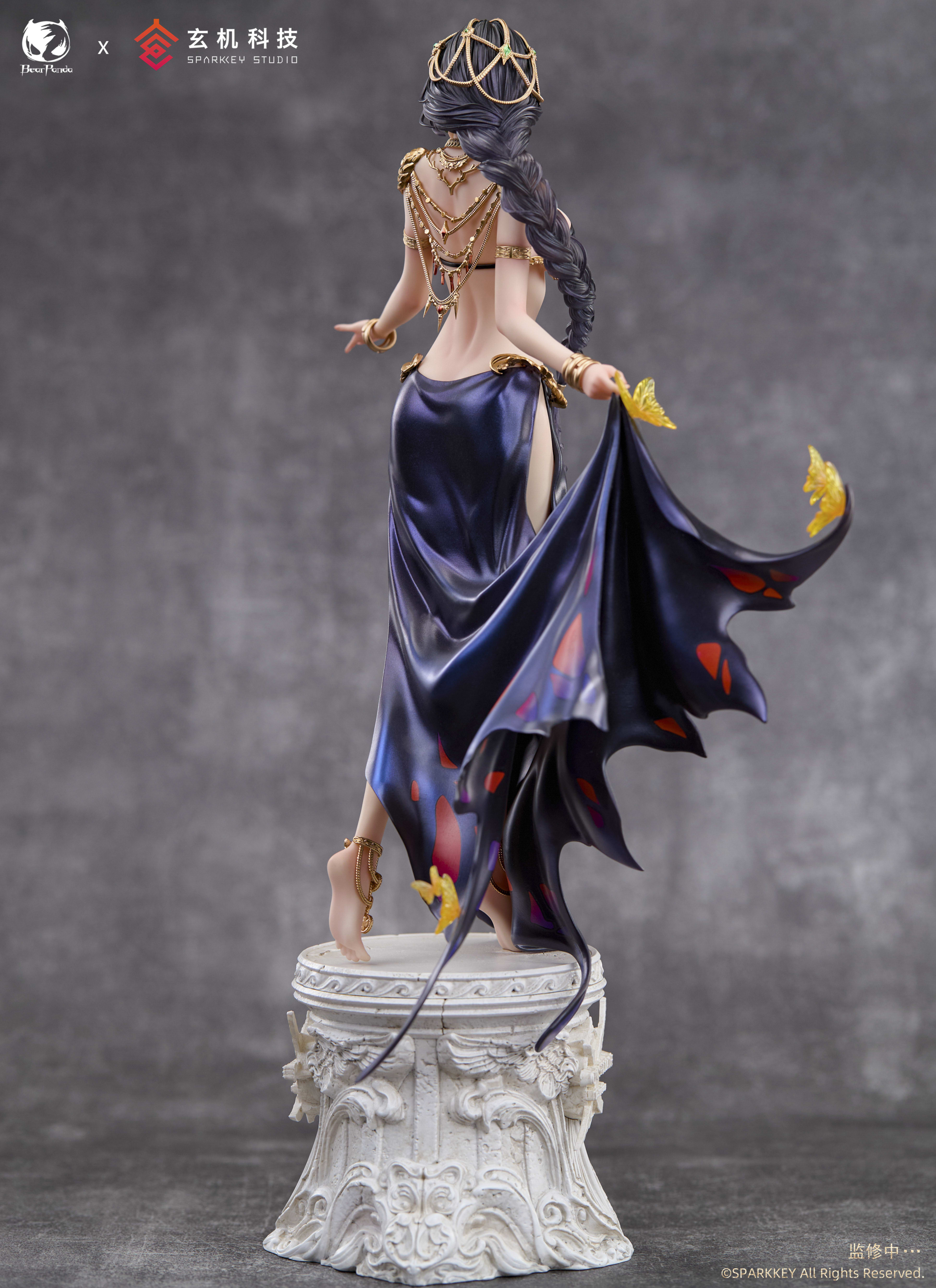 La figura de Aeolian destaca por su falda de un dramático color azul oscuro, sostenida con elegancia por mariposas que parecen dar vida a su atuendo. El borde de la falda imita de manera exquisita las alas de una mariposa, aportando un toque de fantasía y movimiento al diseño. Complementando su atuendo, la figura está adornada con joyería delicada y ornamentos dorados, esculpidos y pintados con un suave brillo metálico que añade realismo y sofisticación.