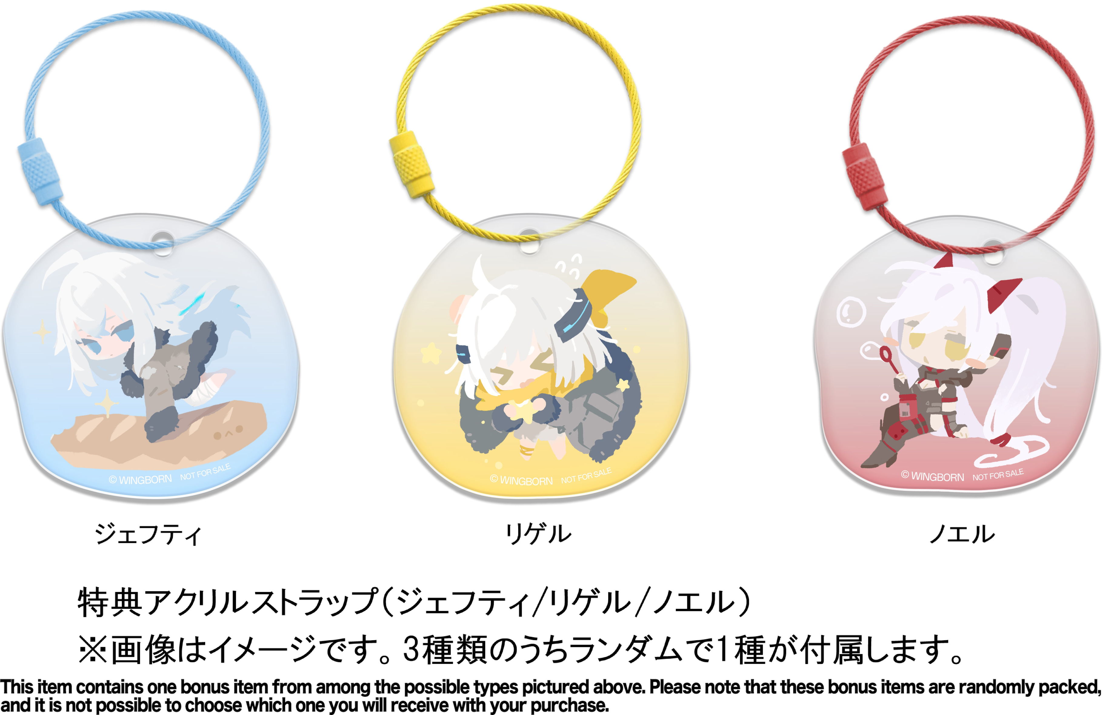 Como un valor añadido especial, esta figura viene acompañada de una correa acrílica aleatoria que incluye una ilustración de Jefuty, Rigel o Noel. Este extra exclusivo no solo complementa la figura, sino que también añade un elemento de sorpresa y emoción al recibir el producto.