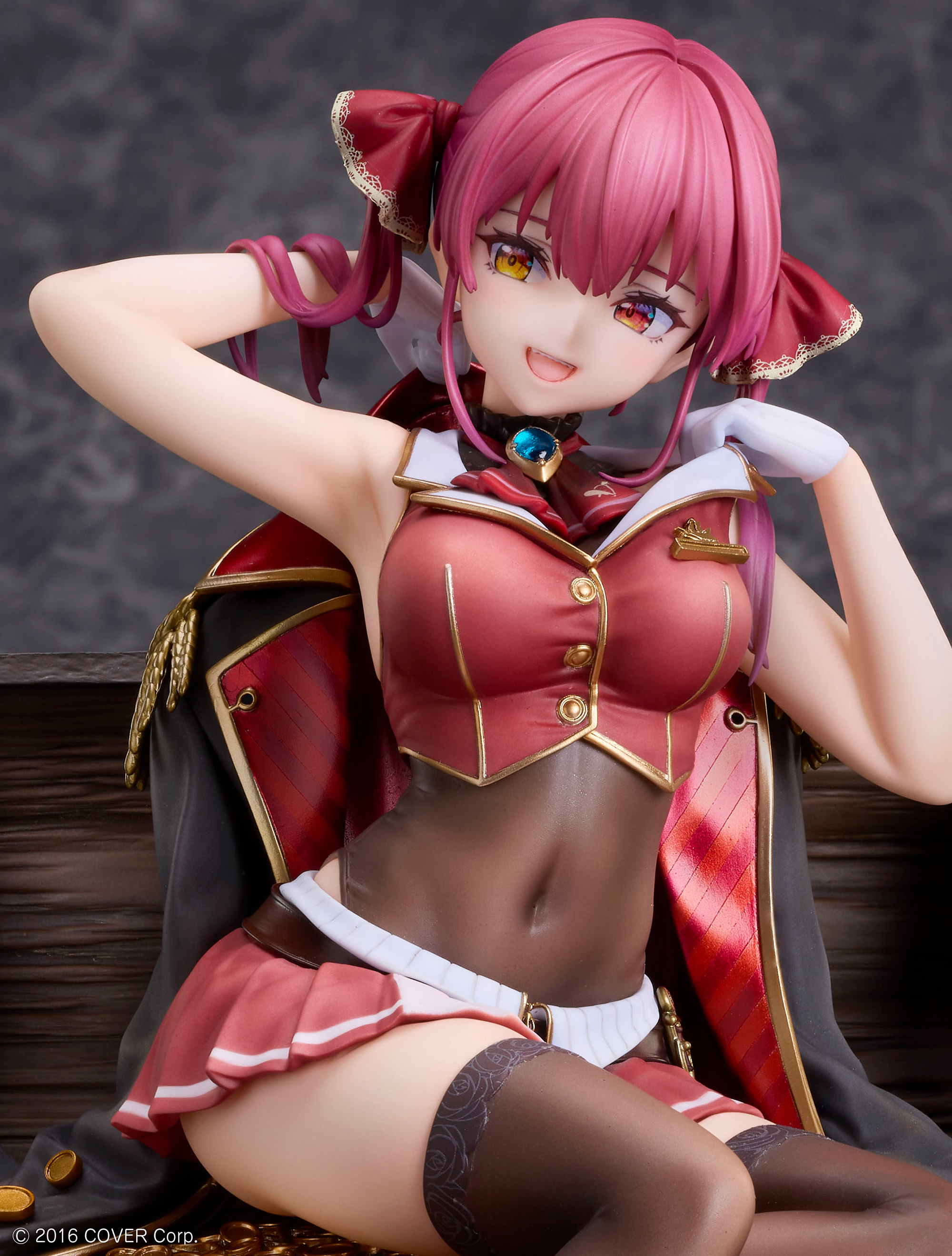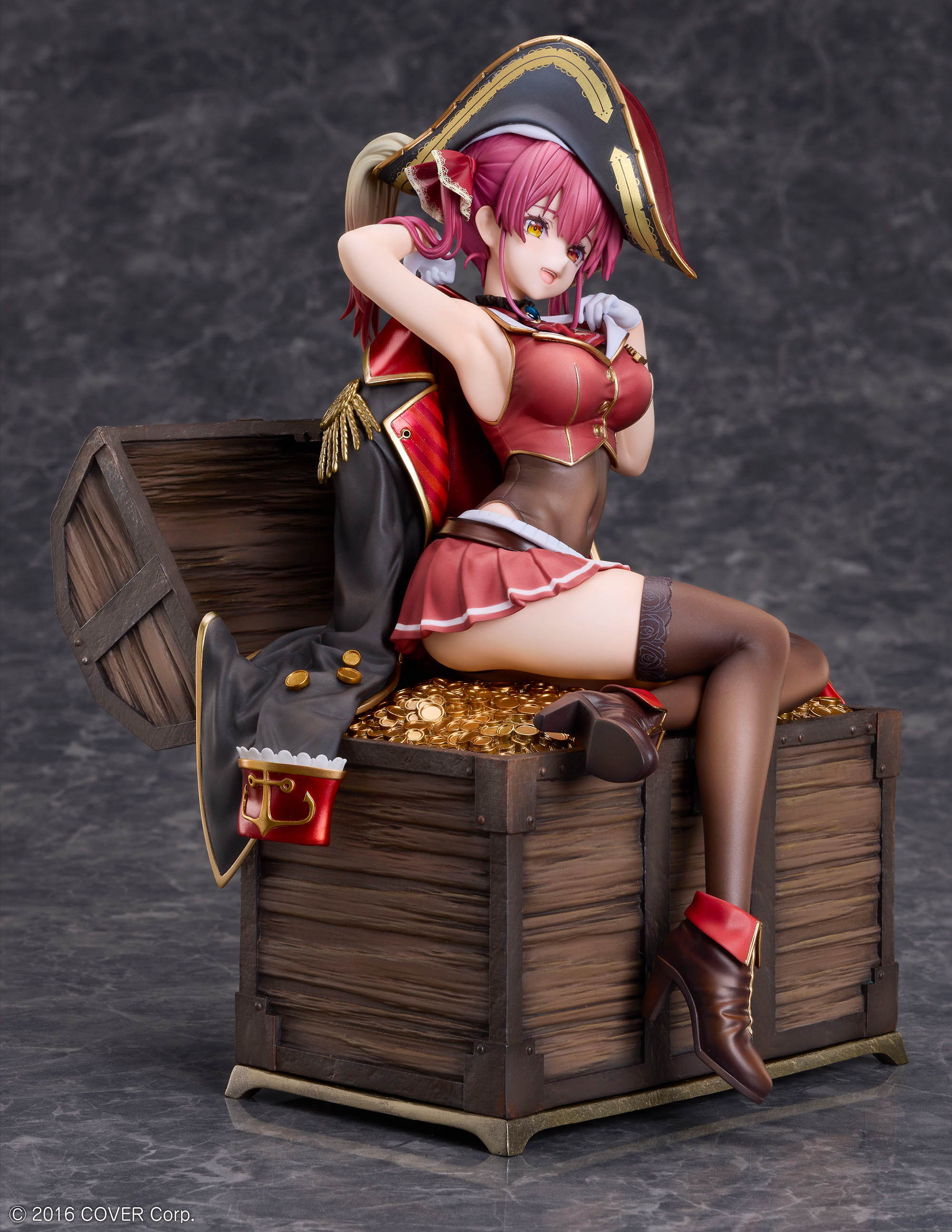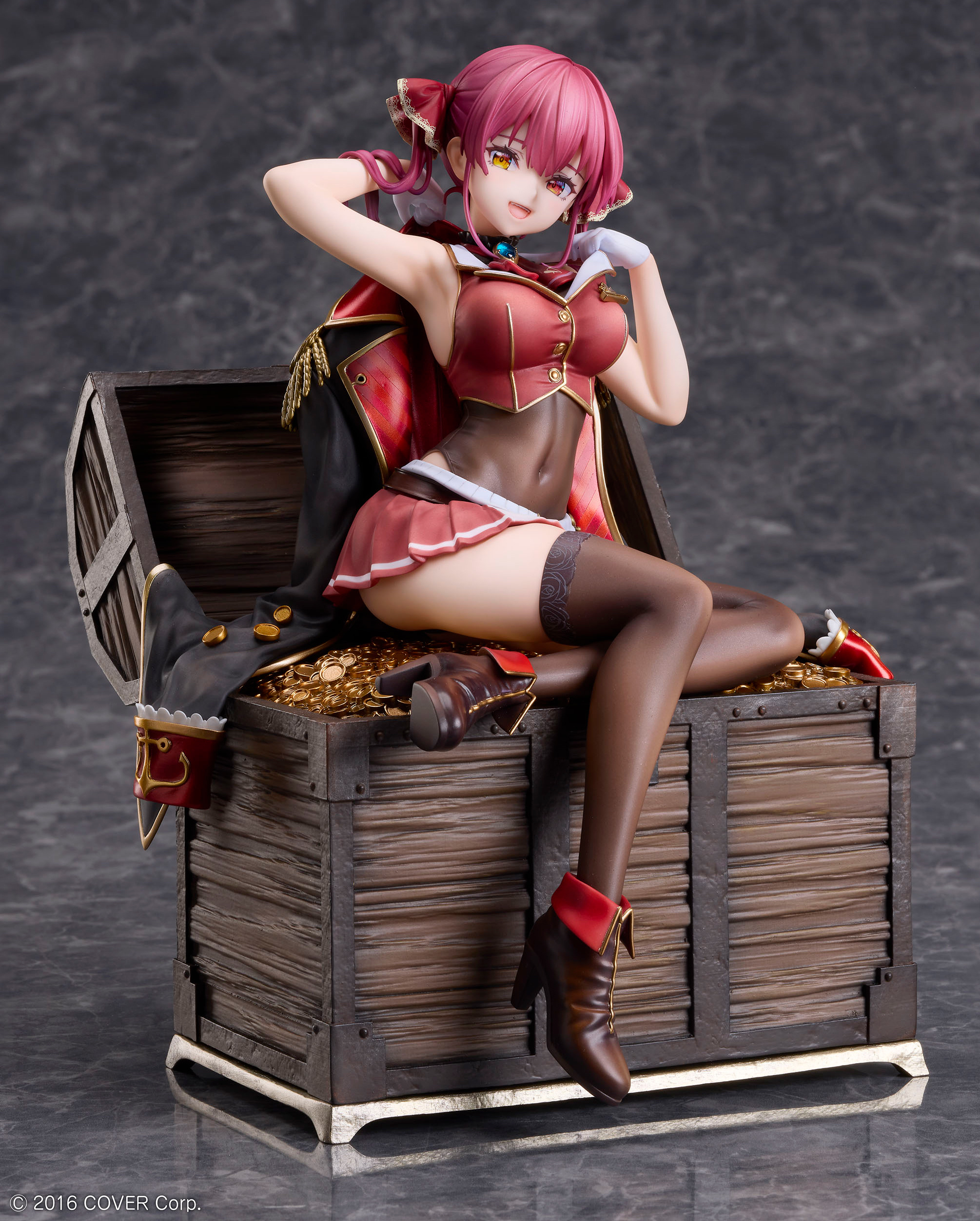 Basada en una ilustración especial creada por Akasa Ai para este proyecto, la figura presenta a Houshou Marine sentada sobre un cofre del tesoro rebosante de monedas doradas. El cofre, con su madera envejecida y las montañas de monedas, está reproducido con un realismo impresionante, haciendo de esta figura una pieza verdaderamente única.