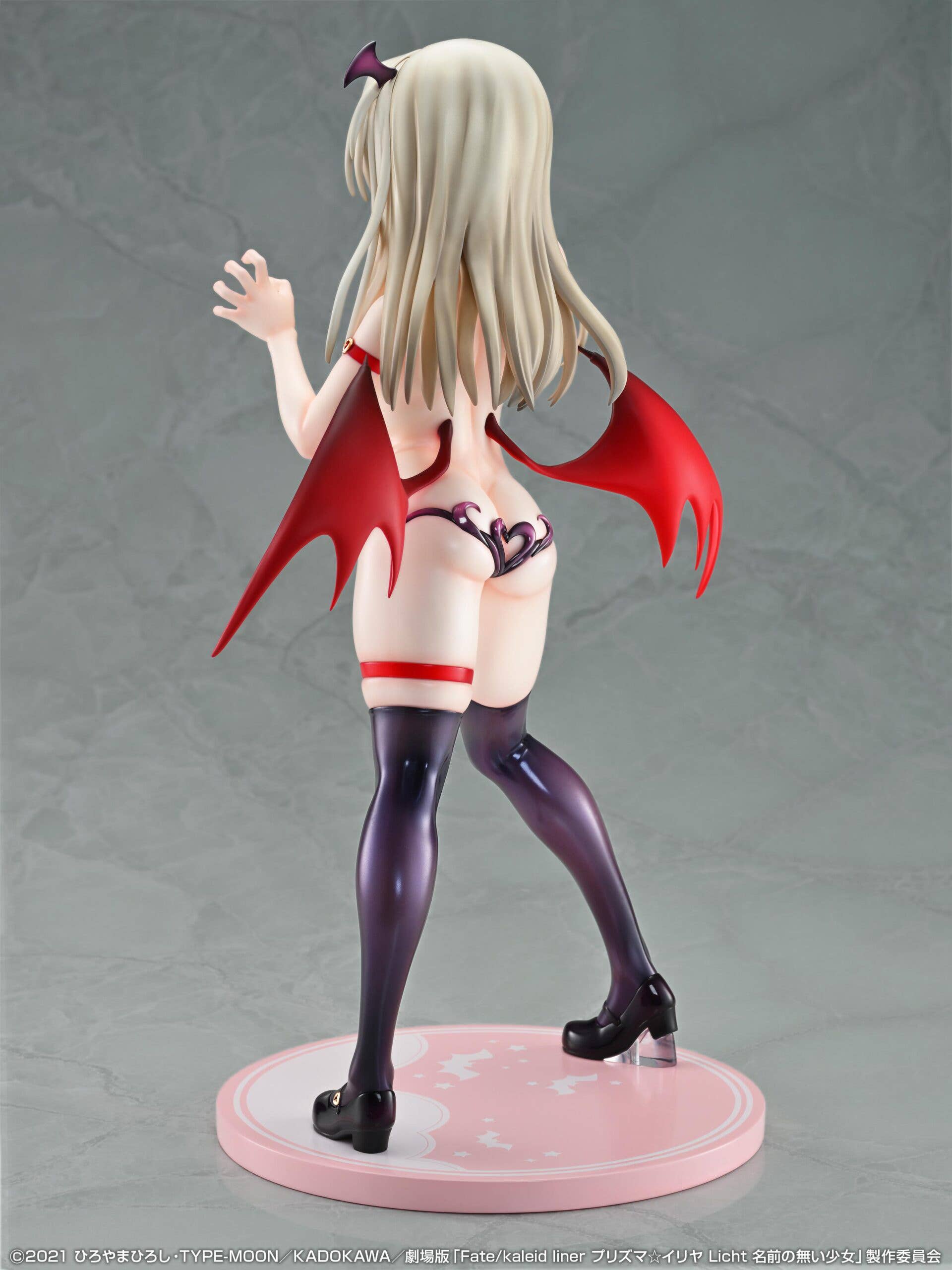 En la película Fate/kaleid liner Prisma Illya Licht Nameless Girl, Illya mantiene ese equilibrio entre inocencia aparente y determinación auténtica, pero aquí la estética se intensifica con una lectura más atrevida y escénica. Esta versión no la presenta como una figura infantilizada, sino como una interpretación de coleccionismo que juega con una imagen de pequeño demonio encantador, enfatizando sensualidad sugerente, fantasía visual y un tono claramente ecchi suave orientado a público adulto coleccionista, sin entrar en terreno explícito.