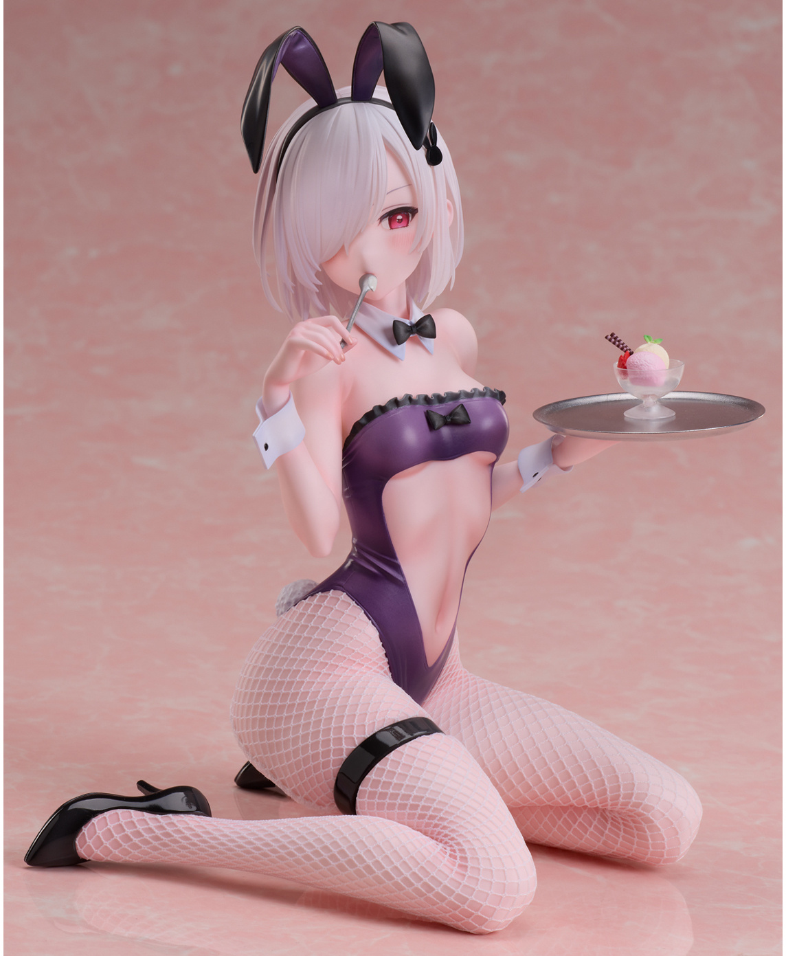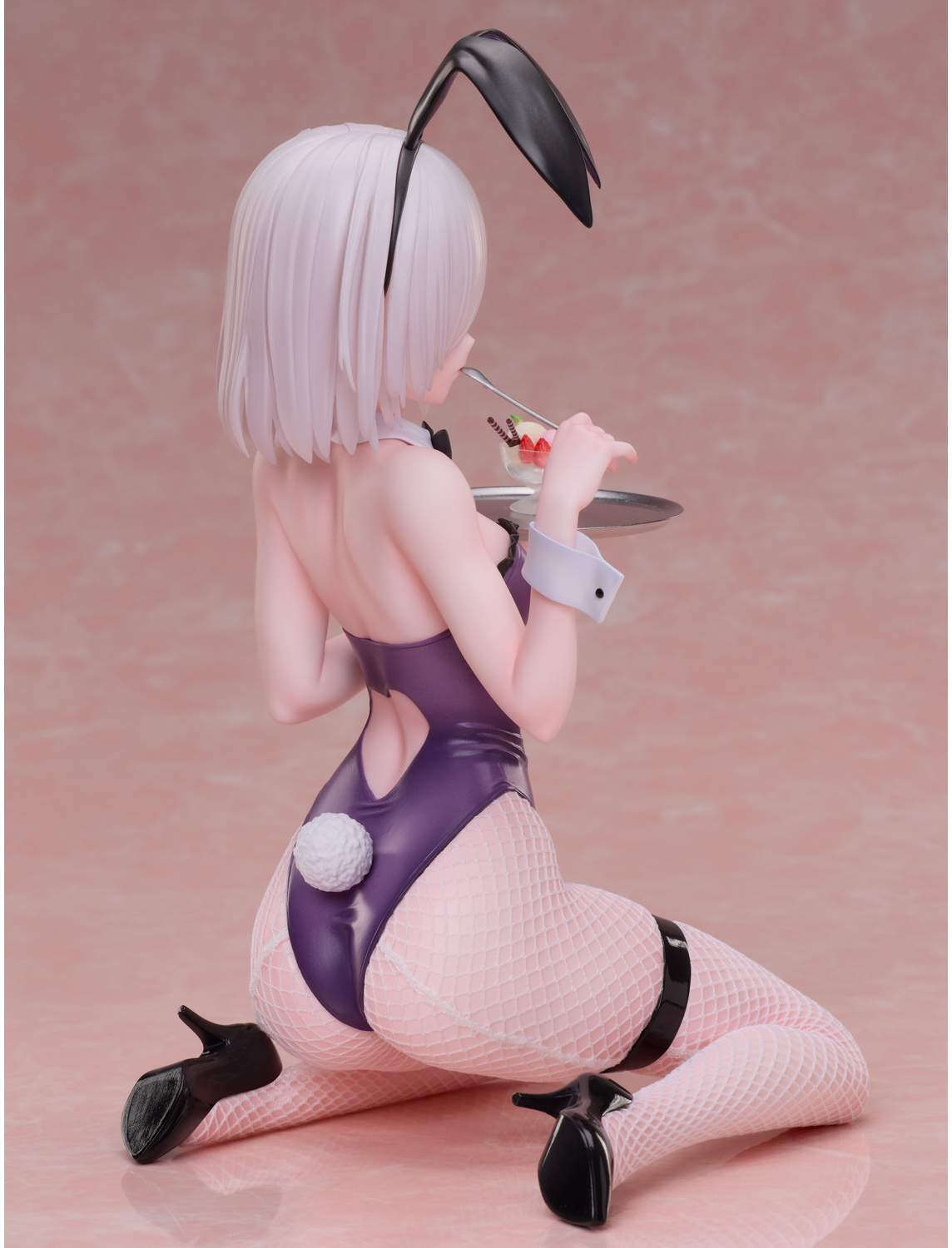 Esta figura ha sido completamente terminada y pintada con un nivel de detalle que la convierte en una obra maestra. La conejita luce un elegante bodysuit de color púrpura profundo adornado con un volante negro en la parte superior. Un detalle encantador es la apertura en forma de corazón en la espalda, que añade un toque coqueto y distintivo. La figura capta un momento divertido en el que la conejita, que debía entregar un parfait, no pudo resistirse a probarlo. Este pequeño guiño aporta personalidad y vida a la figura.