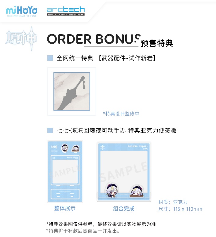 La figura está fabricada con PVC y ABS, materiales conocidos por su durabilidad y capacidad para captar detalles nítidos. Esta combinación asegura que cada característica de Qiqi, desde su vestimenta hasta sus accesorios, sea fiel al diseño original del juego, proporcionando una experiencia visual de alta calidad.