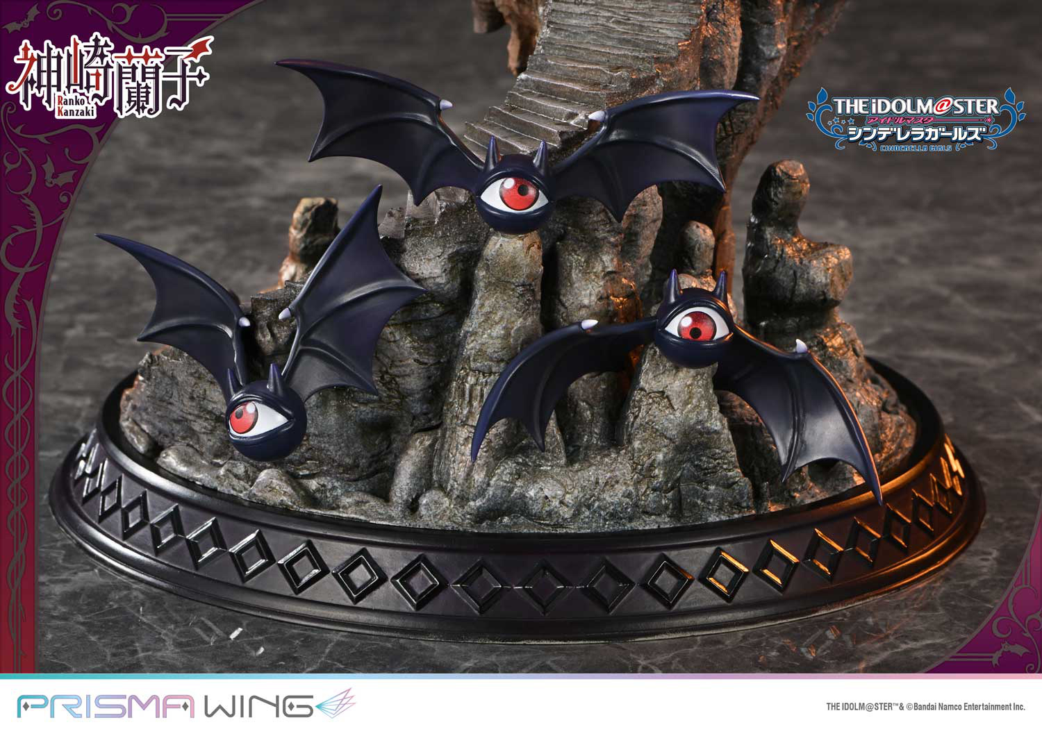 El escenario que acompaña a Ranko es igualmente impresionante. Un castillo se alza majestuoso a sus espaldas, rodeado de monstruos alados inspirados en la ilustración original. Este telón de fondo no solo realza la figura, sino que también añade un elemento narrativo que invita a los coleccionistas a sumergirse en el mundo de fantasía de The IdolM@ster.