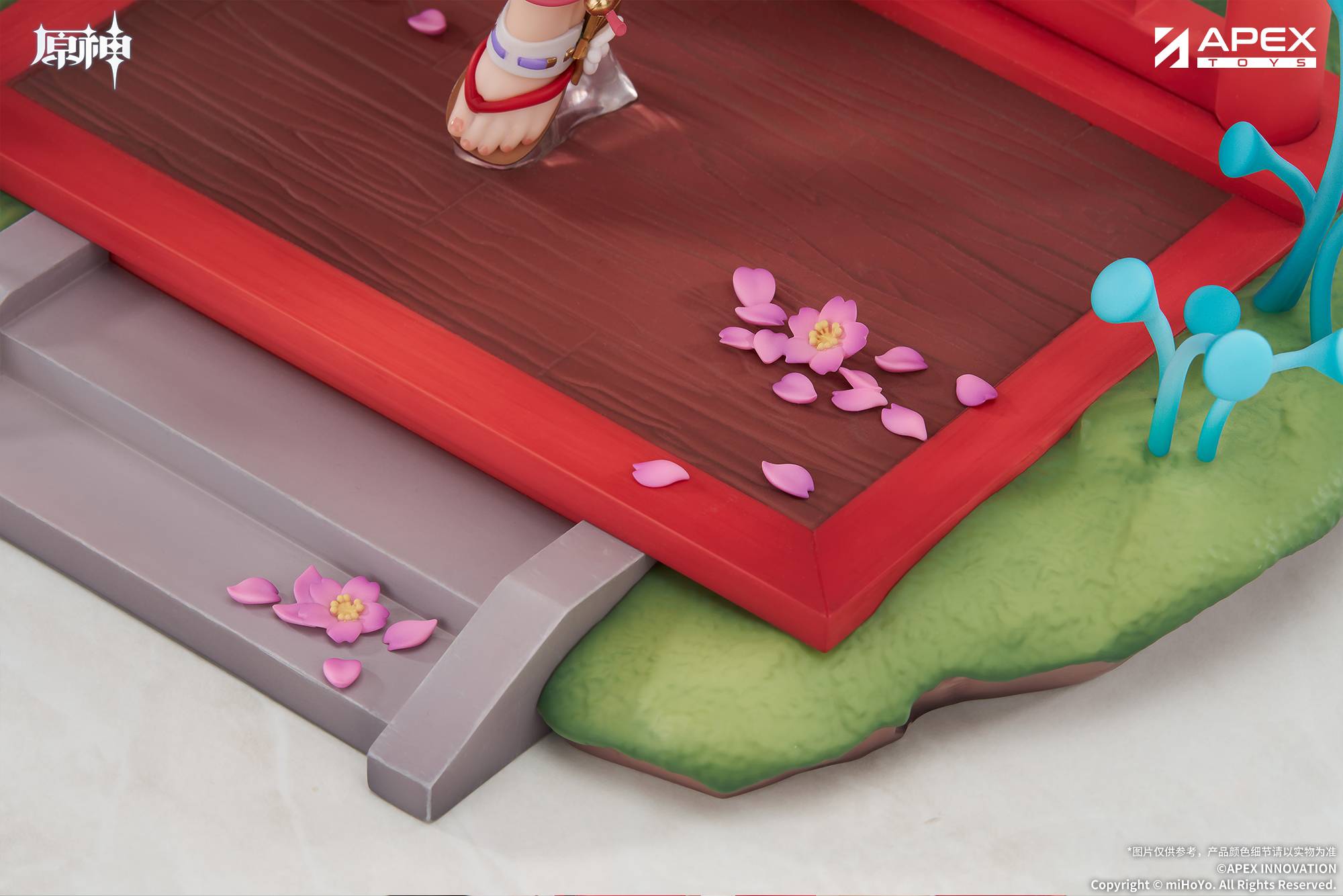 La base personalizada de esta figura recrea un rincón sereno del Santuario Narukami, transportando a los fans directamente al mundo de Genshin Impact. Este nivel de detalle no solo hace que la figura sea una impresionante pieza de exhibición, sino que también mejora la experiencia de inmersión para los seguidores de la traviesa sacerdotisa Kitsune.