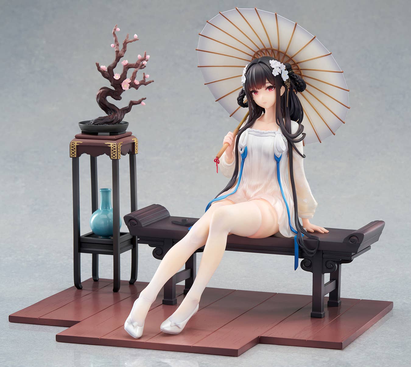 Fabricada en PVC y ABS, la figura ofrece una buena durabilidad y un nivel de detalle adecuado para reproducir elementos complejos como telas, cabello y accesorios decorativos. Estos materiales permiten mantener la calidad de la escultura a lo largo del tiempo.